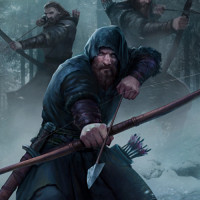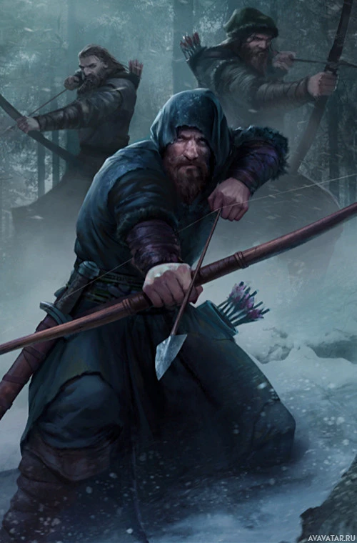 fantasy attire, including a hood and cloak. This individual is holding a bow with an arrow ready for shooting. They are standing amidst