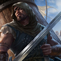 a male character dressed in medieval or fantasy clothing, suggesting the style of an adventurer or warrior. He has a beard and mustache, and is wearing a hood which adds to his