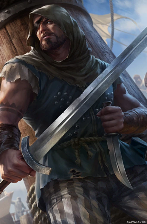 a skilled fighter or capable of wielding weapons. The background suggests a maritime setting, possibly