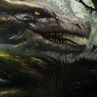 sharp teeth and spiky scales, indicating it's a creature of menace or power in the context of this image. The