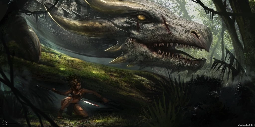 a fantasy scene with a dragon and a human figure in an outdoor setting that appears to be a forest or jungle. The dragon is depicted with large,