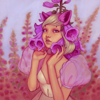 shades of purple and pink. In her hands, she holds flowers that resemble lilies of the valley (Convallaria majalis), which are also depicted around her head and shoulders. The background suggests a garden setting with various floral elements, and there's a soft, dreamy quality to the artwork. The overall impression is one of fantasy or whimsy.