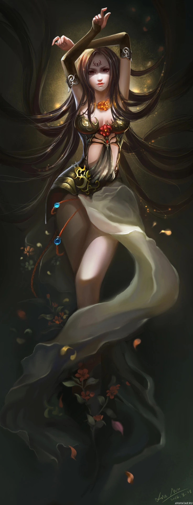 flowing garments that are adorned with what appears to be leaves or foliage, suggesting a connection to nature. The artwork conveys