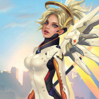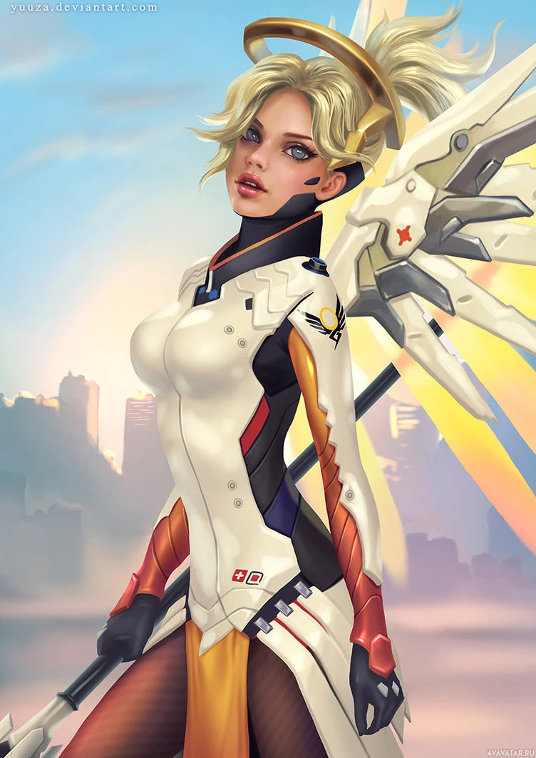 a female character from the video game "Overwatch," known as Mercy. She is depicted in her default pose, which highlights her wings and