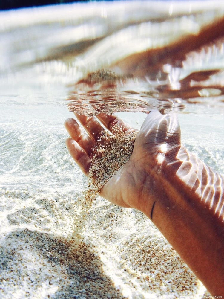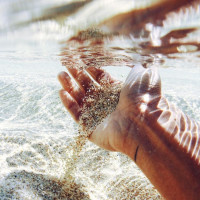 The image shows a person's hand in the sand under water, with their fingers extended. There is also some sand or fine gravel between their fingers, suggesting that they are either creating
