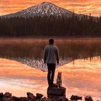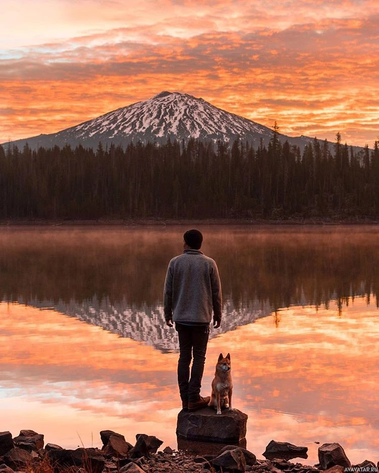 warm colors typical of such an event. Behind the individual, there is a large mountain with snow on its peak, suggesting that this location could be near