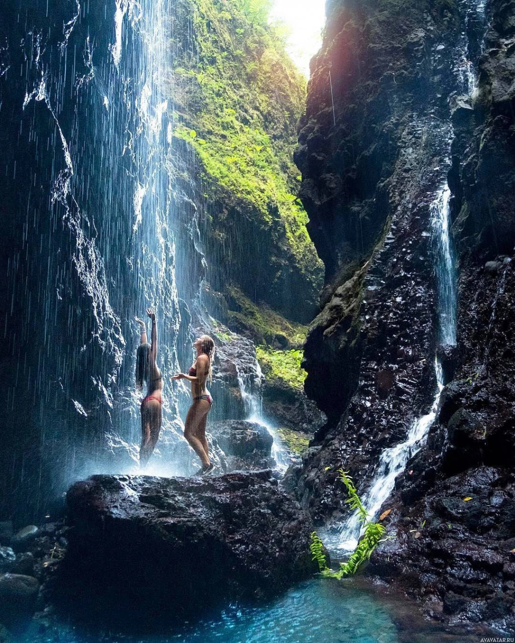 The image shows two individuals in a natural setting, likely a waterfall. They appear to be enjoying the refreshing waters amidst lush greenery. It's a beautiful scene capturing the essence of outdoor recreation and the joy of being immersed in nature.