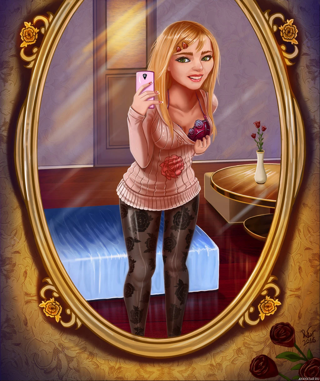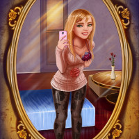 a white sweater and patterned leggings and appears to be smiling at the camera. Behind her, there's a golden mirror reflecting a room that includes a bed, nightstand, and some