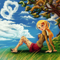 a pleasant day. There are clouds floating near her head, and there's a whimsical touch to the image as if it were a dream or