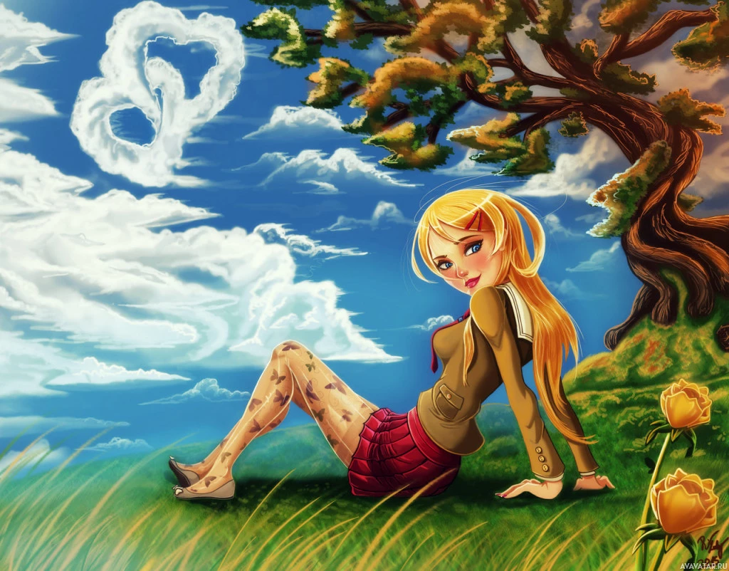 blonde hair. She is sitting on the grass, leaning against a tree that appears to be in