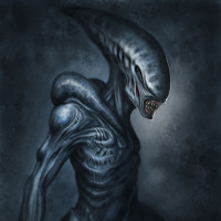 movie series. The creature is shown in its iconic form, with a distinctive humanoid shape but with