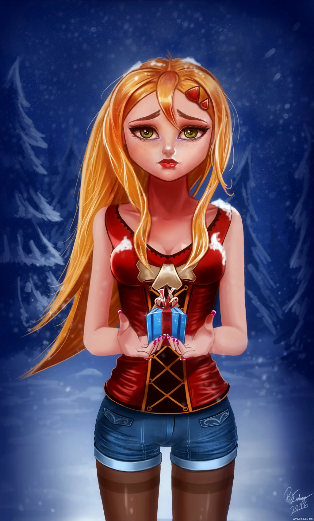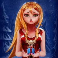 На картинке изображена женщина с светлыми волосами и красными глазами. Она держит небольшой синий подарок, предполагая, что она может праздновать или получать подарок во время Рождества. На заднем плане есть снежная сцена, которая подразумевает, что это зима, вероятно, в рождественский сезон.