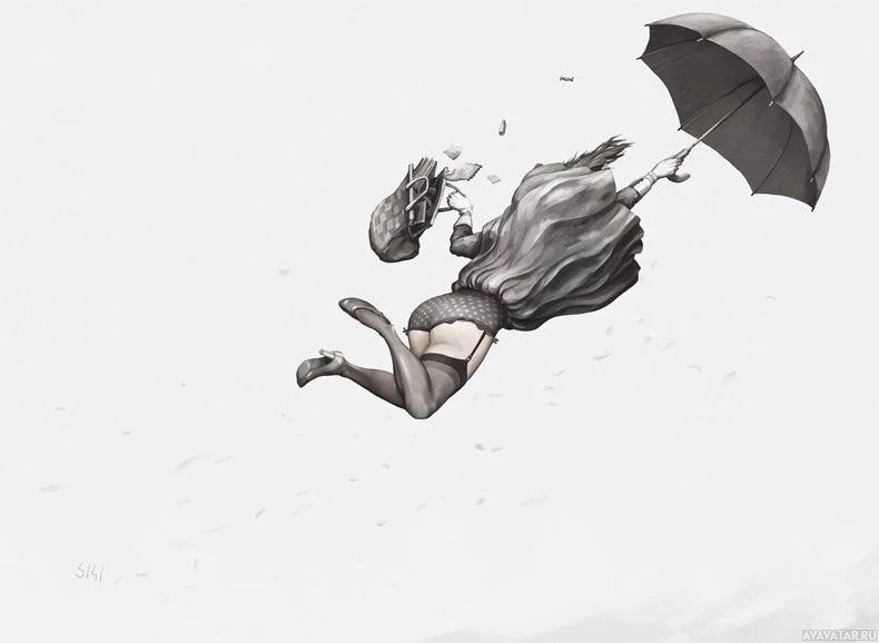 long hair that is flowing behind her, and she's holding onto an umbrella that appears to be causing her to flip upside down. It seems like the umbrella is caught in