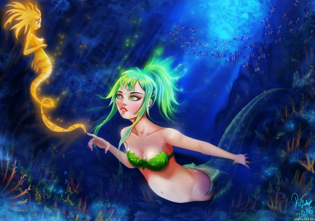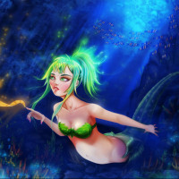 green hair and is wearing a green and yellow outfit that resembles seaweed, which is fitting for her aquatic nature. Her tail is visible, indicating she's a half-human, half-