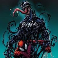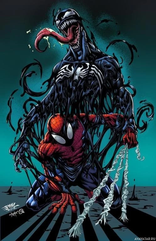 costume with a spider emblem on his chest. To the right is Venom, known for his black