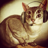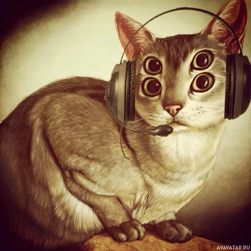 На этом изображении изображен кот, одетый в пару наушников. Наушники имеют микрофонные насадки, которые, кажется, находятся перед глазами кошки, придавая ей выражение, как будто у нее три глаза. Это создает игривый и сюрреалистический визуальный эффект.