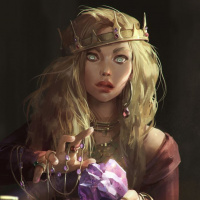 royal attire including a crown and holding an object that resembles a crystal ball in one hand while the other hand is reaching towards it. The setting looks like a dimly