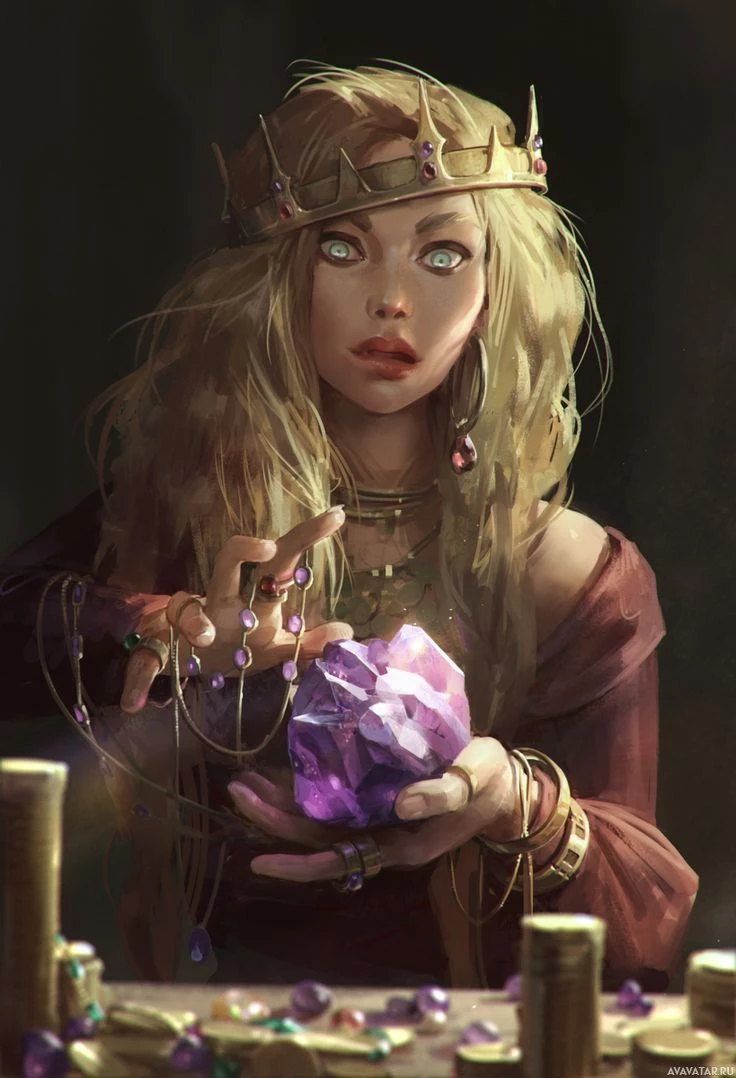 lit room, possibly suggesting a magical or enchanted atmosphere. There are various other jewelry pieces and what appear to be magical elements scattered around her, contributing to the fantastical theme of the image.
