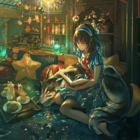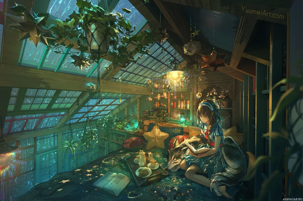 various plants and flowers, creating a lush and verdant atmosphere. There's a dog sitting next to her, looking calm and relaxed. The girl is engaged in reading a book, which she holds in her hands. The scene exudes a serene and peaceful ambiance, capturing the essence of
