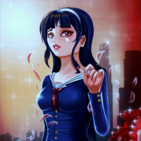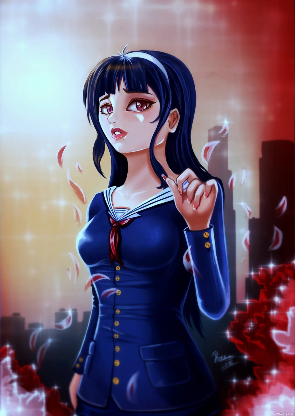 a red flower are gently falling around her. The background suggests a cityscape at dusk, with the sky transitioning into night. The character is shown in