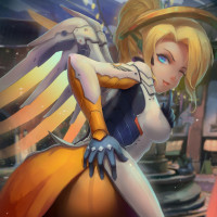 futuristic armor with elements that suggest she might be an angelic or cybernetically enhanced being, given her wings and mechanical parts. The image appears to be