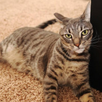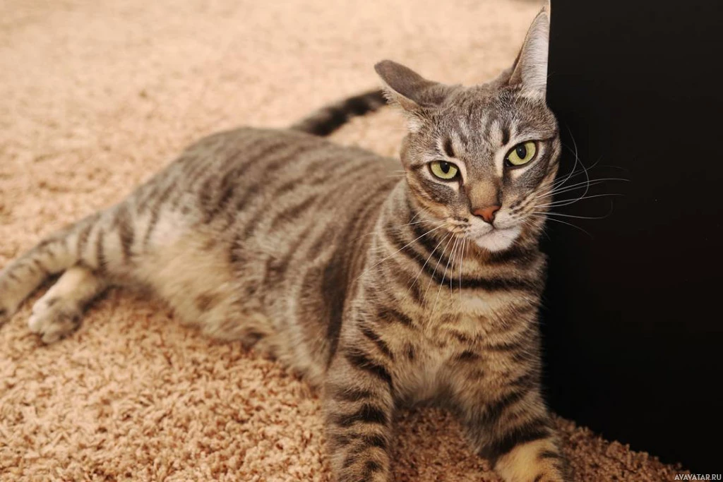 In the picture, there is a cat with a striped coat. The cat appears to be lying down on what looks like a carpeted floor, and it's looking directly at the camera with an alert expression.