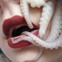The image shows a person's lips with red lipstick, and an octopus is being playfully inserted into the mouth. The person appears to be biting the tentacles of the octopus, creating a surreal or artistic effect.