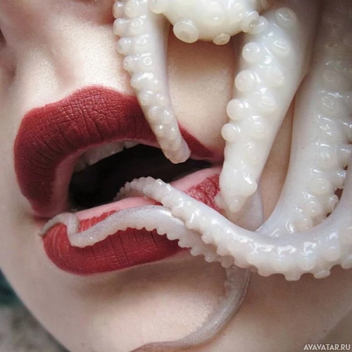 На снимке губы человека накрашены красной помадой, а в рот ему игриво засовывают осьминога. Кажется, что человек кусает щупальца осьминога, создавая сюрреалистический или художественный эффект.