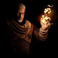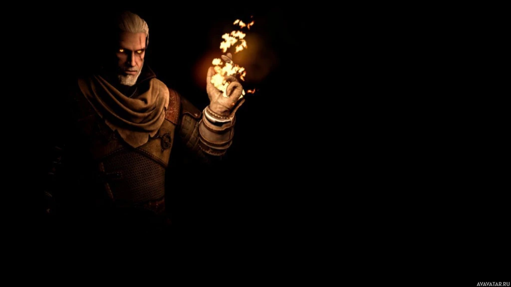 the video game "The Witcher 3: Wild Hunt," specifically Geralt of Rivia. He is depicted holding up his hand in a gesture that resembles casting a spell or preparing to fight, with light emanating from his fingers, which suggests he might be performing