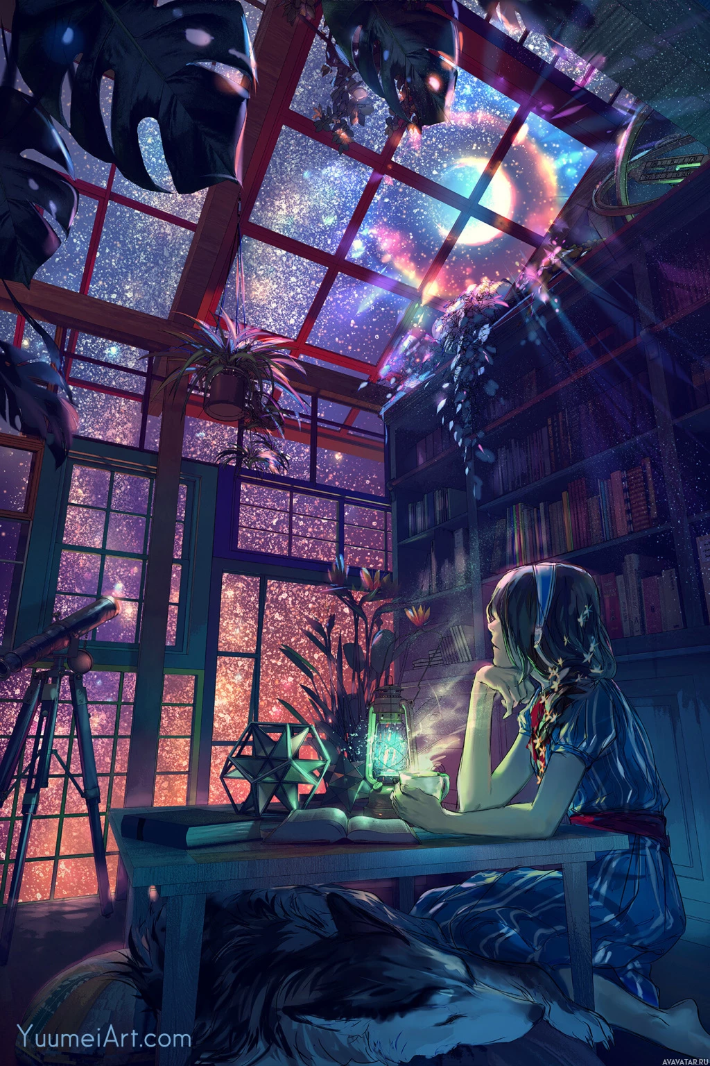 night sky through an open window, adding to the magical or fantasy atmosphere of the scene.