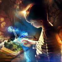 a young boy engrossed in reading a book with illustrations that seem to come alive. He is surrounded by an enchanting