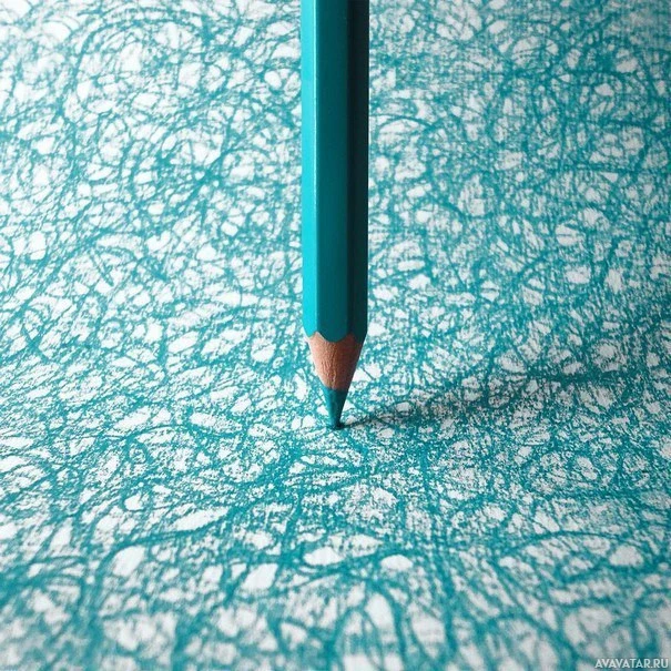The picture shows a close-up of a blue pencil tip with a pattern of lines and shapes that resemble a fractal or intricate design, resting on what appears to be