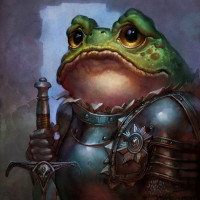 The image shows an anthropomorphic toad wearing a suit of armor. The toad has large eyes and is holding a sword in its hand, giving it the appearance of a knight or warrior from a fantasy setting. It's a creative representation combining elements of different species into one character.