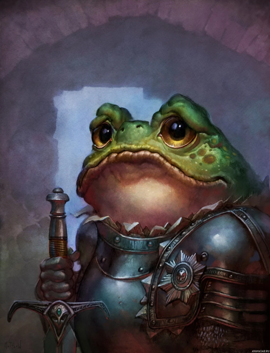 На снимке изображена антропоморфная жаба в доспехах. Жаба имеет большие глаза и держит в руке меч, придавая ему вид рыцаря или воина из фэнтезийной обстановки. Это творческое представление, объединяющее элементы разных видов в один персонаж.
