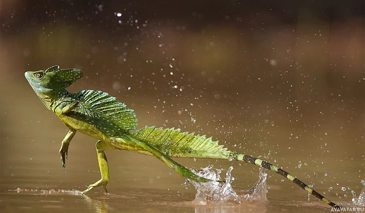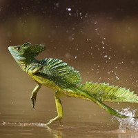 The image depicts a lizard, specifically a Basilisk, which is known for its ability to run on water. This animal is characterized by its greenish-brown coloration with black stripes down the sides and