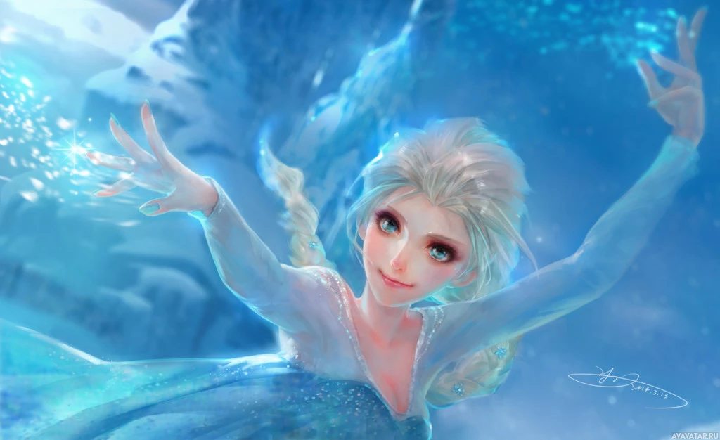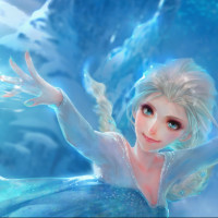 ice crystals around her, which aligns with the character's ability to create snow and ice in the movie she is featured in.