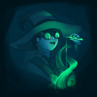 green energy emanating from the wand they're holding, indicating that some sort of magical action is taking place. The style of the illustration and the attire suggest a connection to