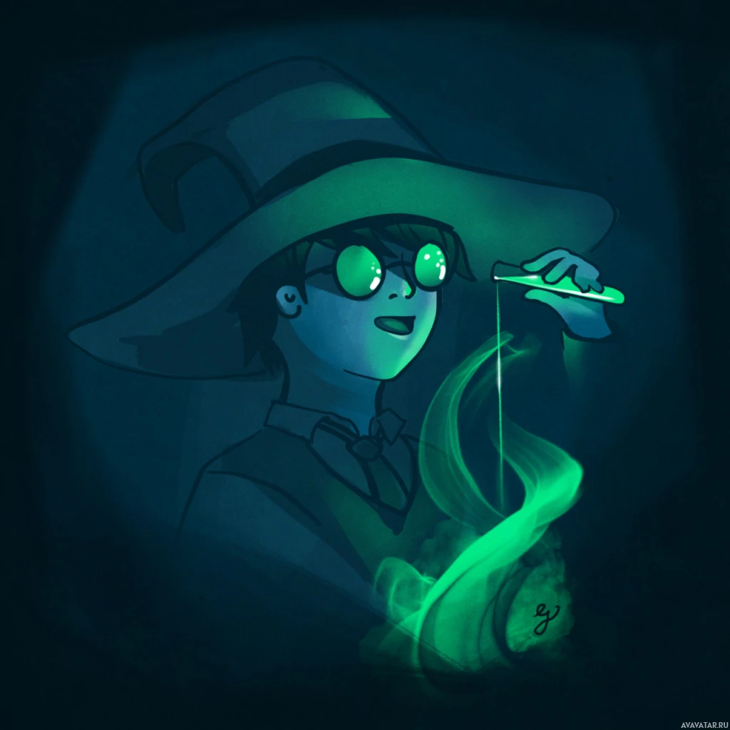 witch hat and glasses, which are typical attire for such fantasy figures. The character has