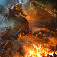 sharp teeth, set against a chaotic background of fire and smoke, suggesting destruction or battle. The artwork is vibrant and dynamic, conveying a sense of intensity and danger typical in