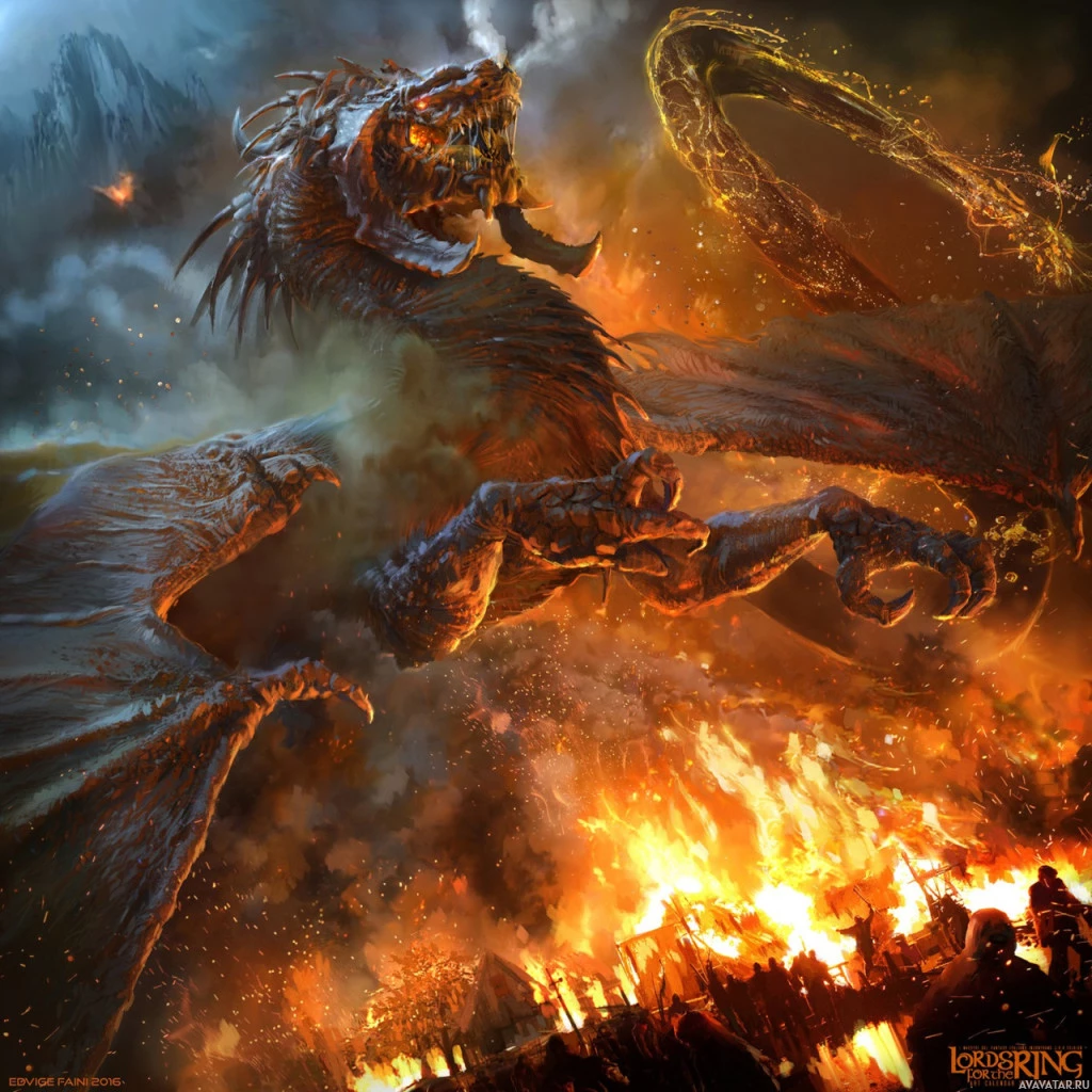 a fantasy scene with a dragon at the center. The dragon appears to be a fierce creature, with large wings and