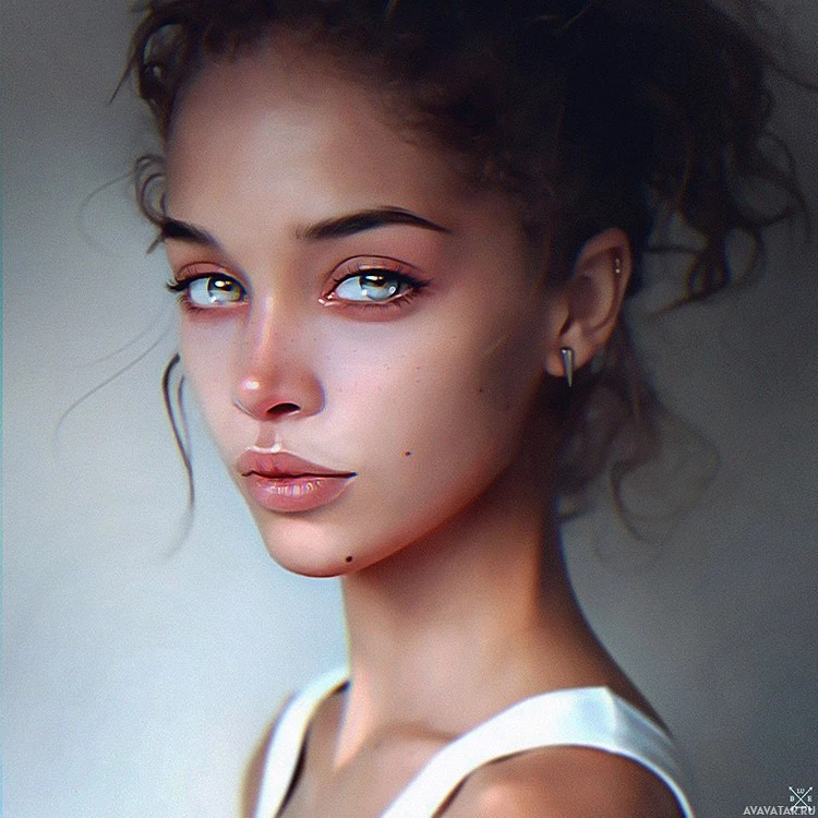 subdued atmosphere that highlights her facial features. There are no visible tattoos or other distinguishing marks on her skin, and she does not appear to be wearing any accessories like earrings. Her gaze is directed straight at the camera, which gives her a poised and contemplative expression.