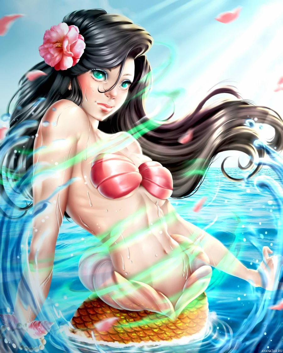 The image depicts a fantasy-themed illustration of a mermaid. She is seated on what appears to be the tail of another creature, possibly a dragon or a sea serpent, as it is not common for mermaids to ride fish in