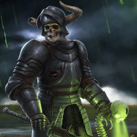undead warrior. The background gives off an ominous vibe with dark colors and lightning bolts streaking across the sky, which adds to the overall