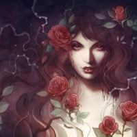 flowing hair and a mysterious or contemplative expression. She is surrounded by rose flowers, some of which are blooming while others are not. Her hair appears to be intertwined with the roses, suggesting a connection between her and the floral elements in the picture. The overall tone of the image is romantic and ethereal, evoking