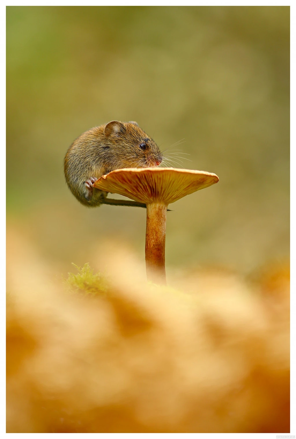 a small animal, which appears to be a mouse, standing on the edge of a mushroom. The background suggests it might be taken in