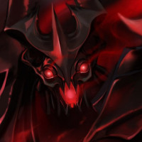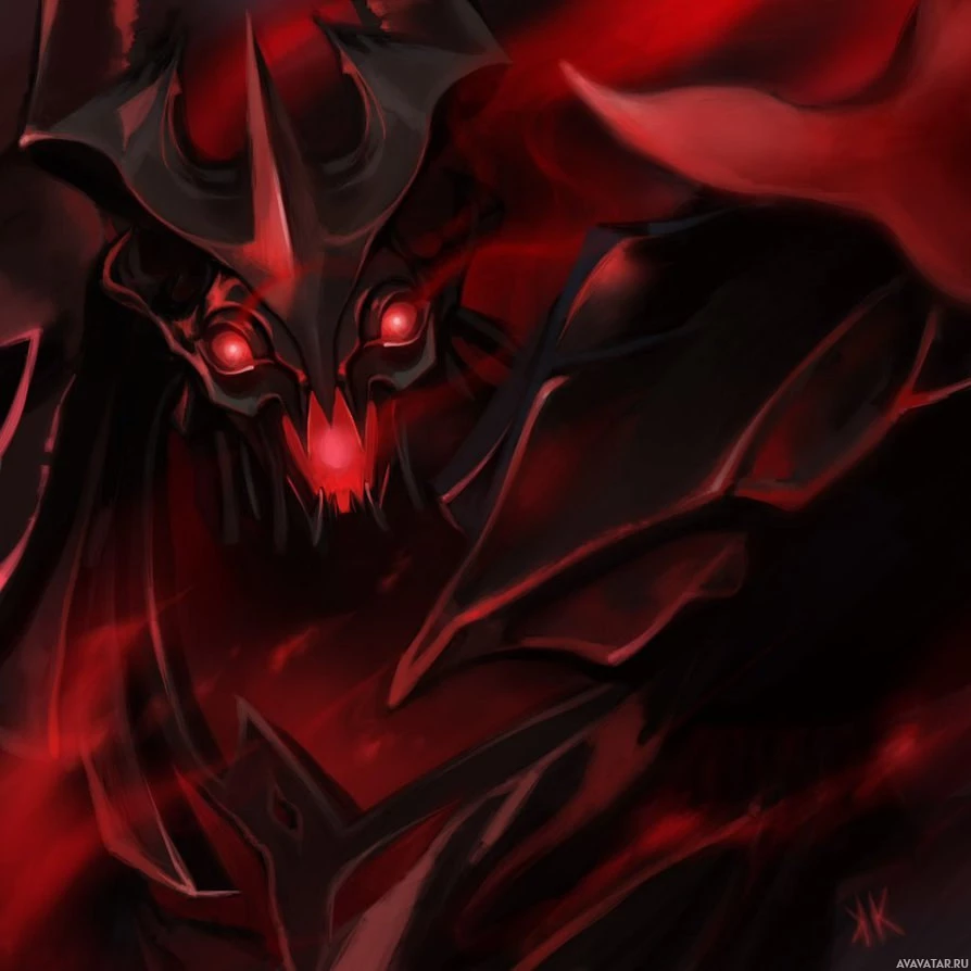 red eyes, dressed in dark armor with spikes on it. It appears to be emerging from or immersed in a red, misty background that could represent its