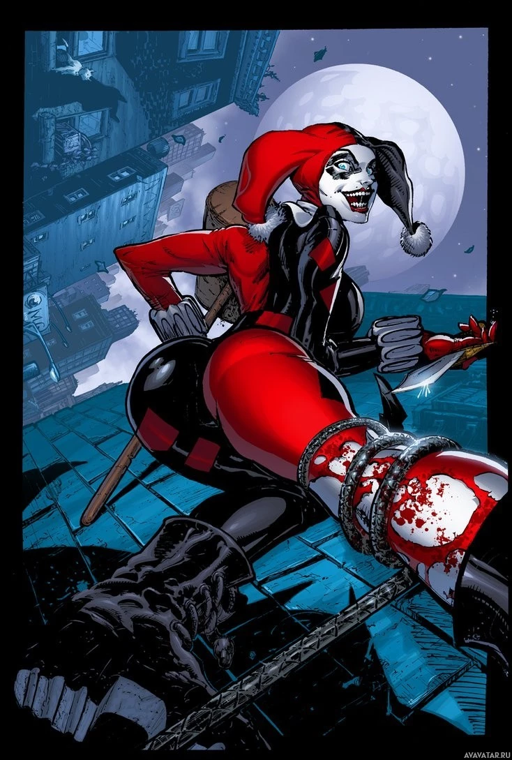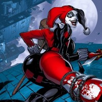 Harley Quinn, who is a fictional antiheroine from comic books published by DC Comics. She is known for her distinctive outfit and makeup, which includes a red bodysuit with