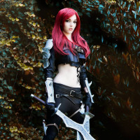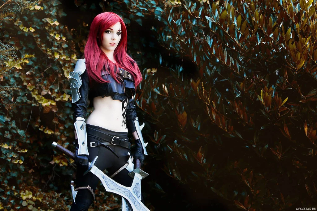 The image features a person dressed in cosplay, emulating the character of Katarina from "