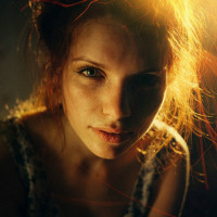 light source that creates an atmospheric effect around her. Her expression is focused or contemplative, and she seems to be looking slightly off-camera. There's also some smoke or mist that gives the image a somewhat ethereal quality. The overall mood of the picture appears moody or introspective.