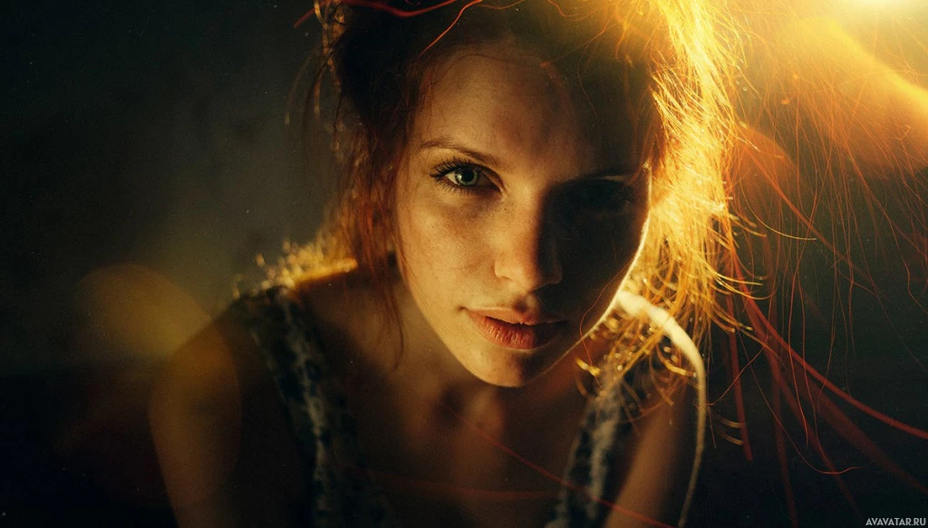 a young woman with fair skin and reddish hair. She appears to be seated in front of a warm, ambient